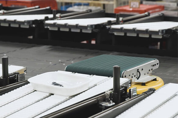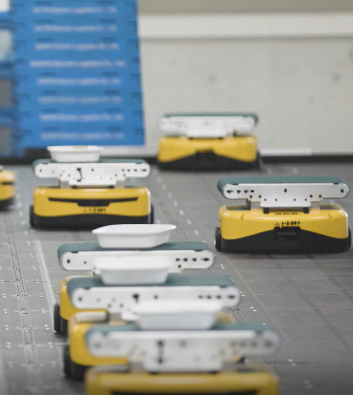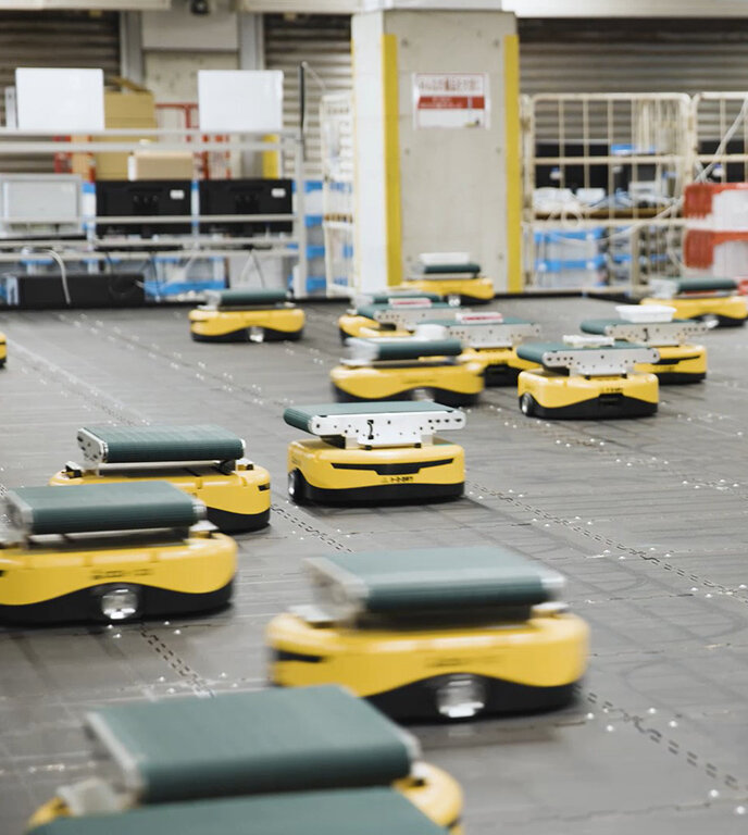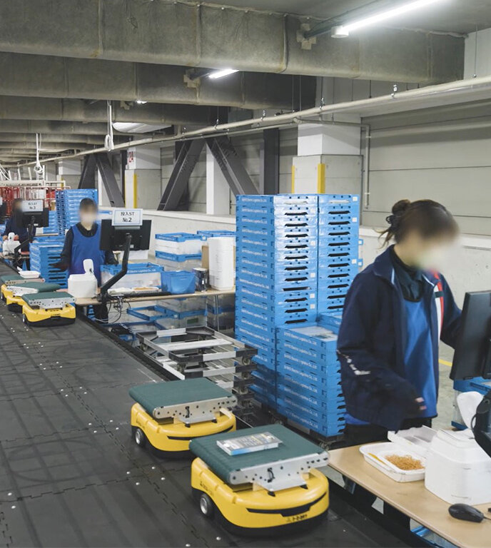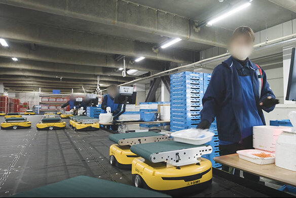 福岡事業所に導入されたT-sortは、対象の仕分け商品を投入する4つの投入ステーションと2つのレーンで構成されています。処理能力2,000/時のAMR40台が縦横無尽に動き、約100店舗への仕分けを行います。
