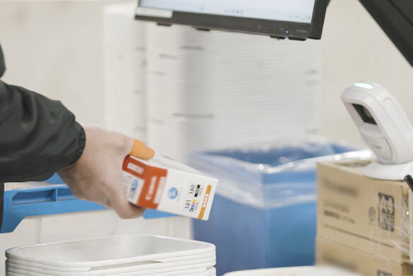 投入ステーションの作業者は、小物家電の商品バーコードをスキャンしてAMRに載せ、モニタを操作したら作業完了です。